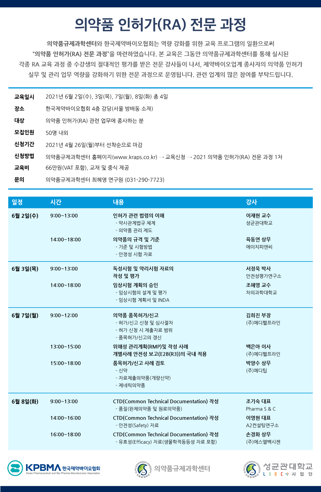 본 교육은 그동안 의약품규제과학센터를 통해 실시된 각종 RA 교육 과정 중 수강생의 절대적인 평가를 받은 전문 강사들이 나서, 제약바이오업계 종사자의 의약품 인허가 실무 및 관리 업무 역량을 강화하기 위한 전문 과정으로 운영됩니다.