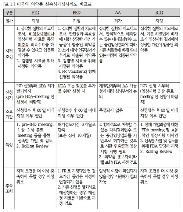 미국은 1988년부터 의약품에 대한 환자 접근성을 확대하고자 생명을 위협하는 질환에 사용되는 의약품의 신속한 개발 및 시판허가를 위해 Fast Track Designation(FTD)을 시행해 왔다. 아울러 안정성과 유효성에 대한 개선이 있고 생명을 위협하는 질환의 치료에 사용되는 의약품에 대해서는 허가심사기간을 단축하는 제도인 Priority Review Designation(PRD)과 함께 생명을 위협하는 질환을 대상으로 기존의 치료방법보다 효과적인 치료제에 대한 개발과 허가기간을 단축할 수 있도록 대체지표를 기반으로 허가심사하는 Accelerated Approval(AA) 제도를 시행하고 있다. 또한 Breakthrough Therapy Designation(BTD) 제도를 통해 중증질환이나 생명을 위협하는 질환의 치료를 목표로 하는 임상시험 초기에 상당히 개선된 치료 효과가 확인된 획기적 의약품에 대해서는 그 개발과 허가를 촉진하고 있다.