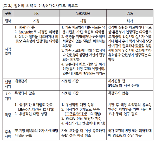 일본의 의약품 신속허가심사제도는 Priority Review(PR)로부터 시작되었다. 이 제도는 희귀의약품, 심각한 질환을 치료하는 신약 등 의학적으로 중요한 의약품에 대하여 해당 질환의 심각성과 치료적 유용성에 대한 전반적인 평가를 통해 선정된 의약품을 우선 심사하는 제도이다. 2015년부터 혁신적인 치료방법이 필요한 질환을 대상으로 하는 의약품 등에서 현저한 유효성이 나타날 것으로 예상되고, 세계 최초로 일본에서 조기 개발, 신청된 의약품에 대하여 우선적으로 상담 및 심사를 실시하고 허가과정을 지원하는 제도인 Sakigake가 시행되고 있다. 2017년부터는 심각한 질병에 효과적인 치료제이나 확증적 임상시험이 어렵지만 이외의 임상결과로 안전성과 유효성이 확인되는 의약품을 대상으로 안전성과 유효성에 대한 재확인 등을 조건으로 허가하는 Conditional Early Approval(CEA)도 시행하고 있다.